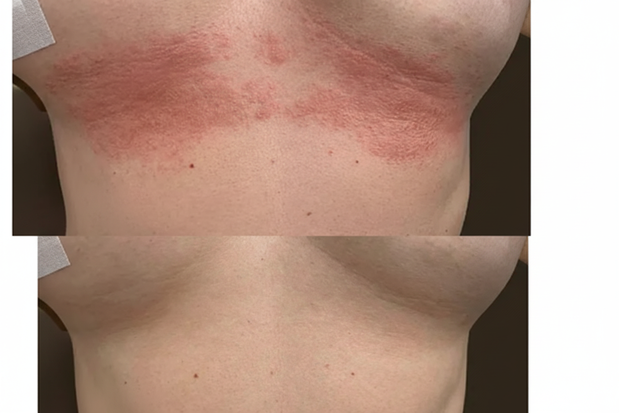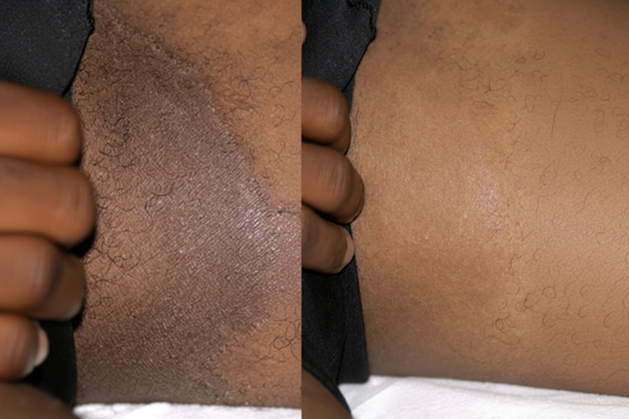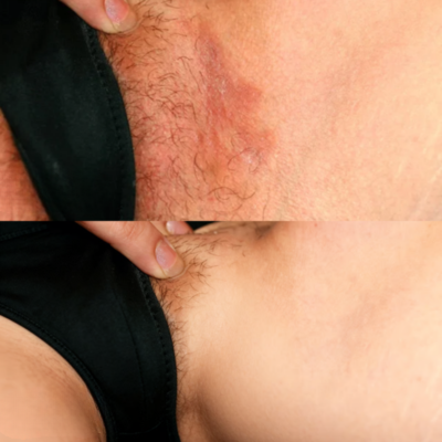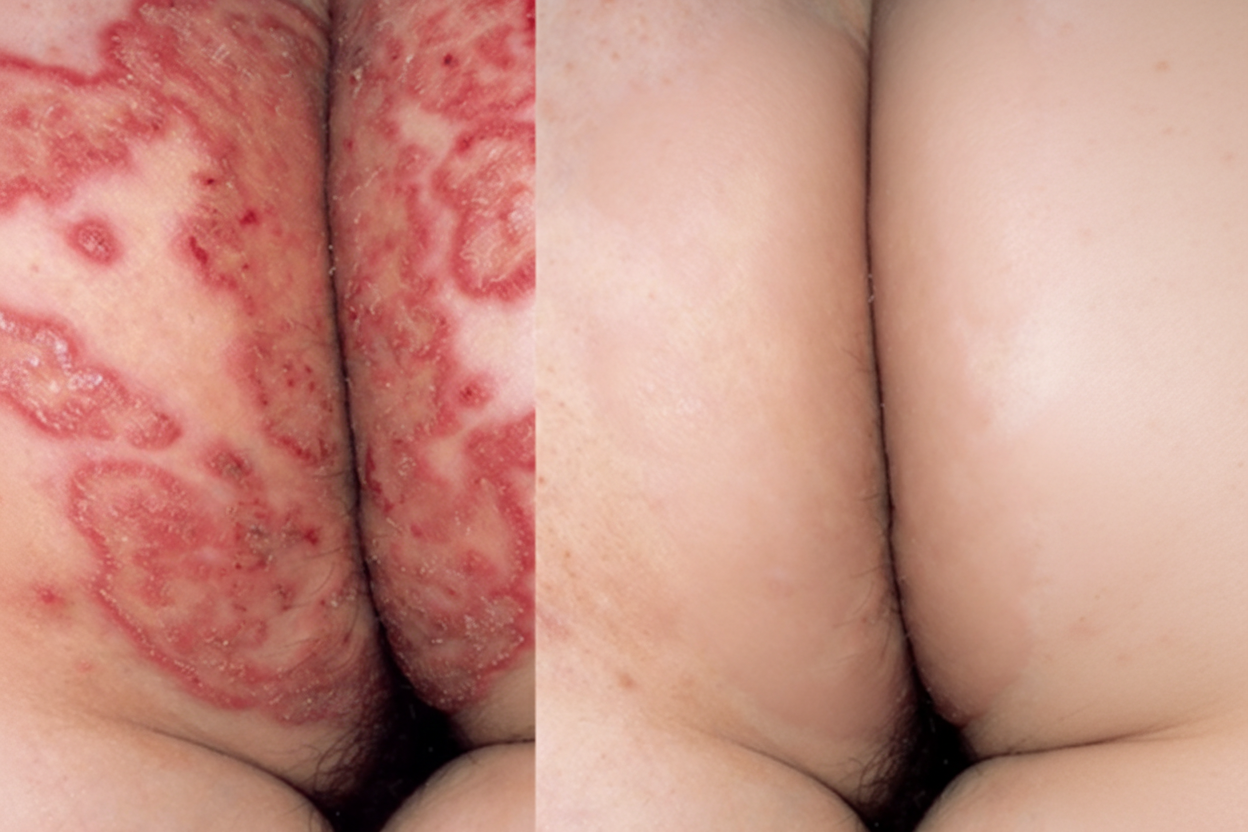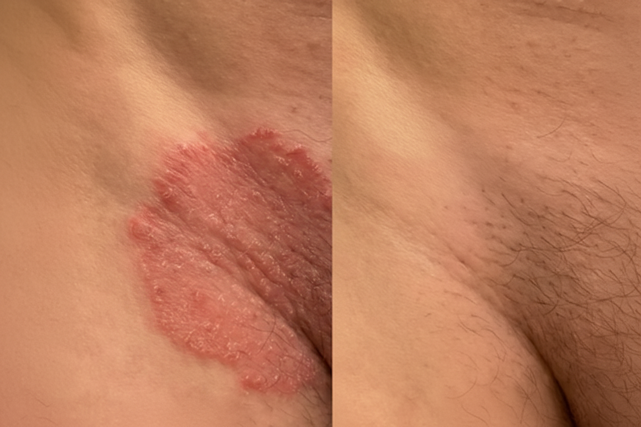 "I had been dealing with this redness and irritation in my groin area for over a year. It was itchy, uncomfortable, and I was too embarrassed to even talk about it. I tried pharmacy creams but nothing worked long-term. After using Oraliyne® soap daily for about 5 weeks, the redness faded completely and my skin looks healthy again. The top photo is before I started, the bottom is now. I finally feel normal again.