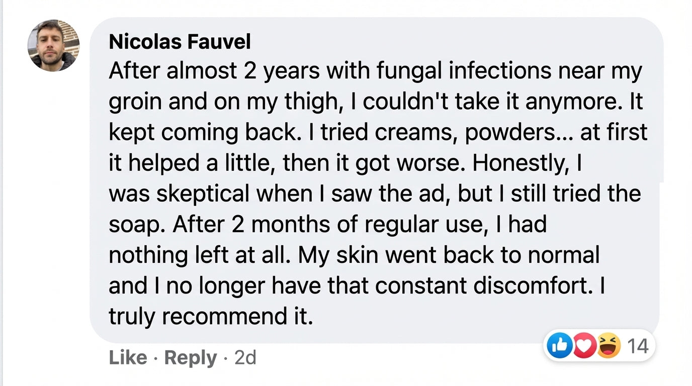 "After almost 2 years fighting fungal infections in my groin, nothing lasted long-term. Creams, powders… it always came back. In 2 months with this soap, nothing left. My skin went back to normal and I no longer have that constant discomfort. It changed my confidence on a daily basis.